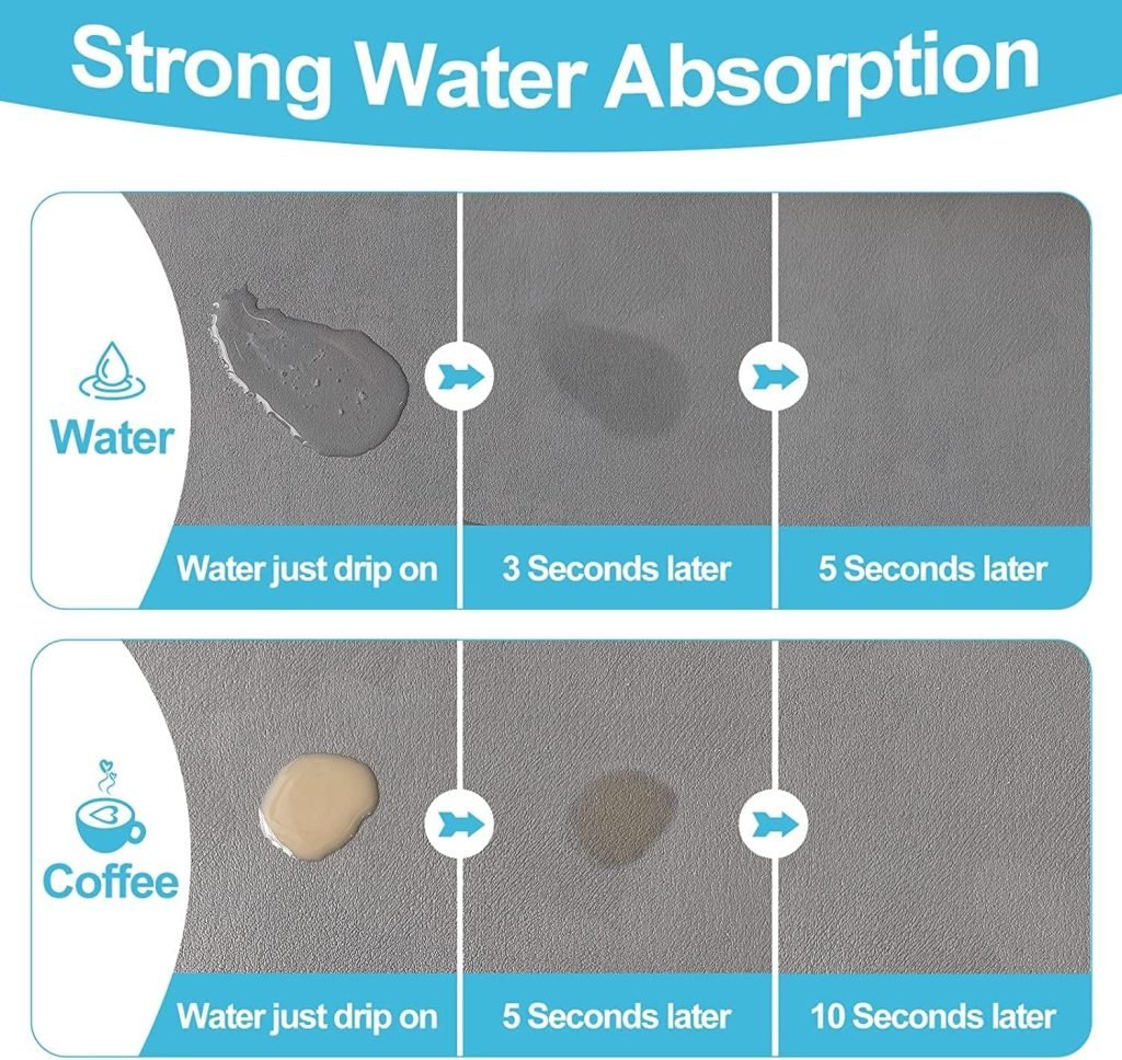 Bathroom: The dish drying mat can be placed next to the sink to hold toiletries or as a soft surface for drying washed hands or small items. Its absorbent material prevents water from pooling and keeps countertops dry.