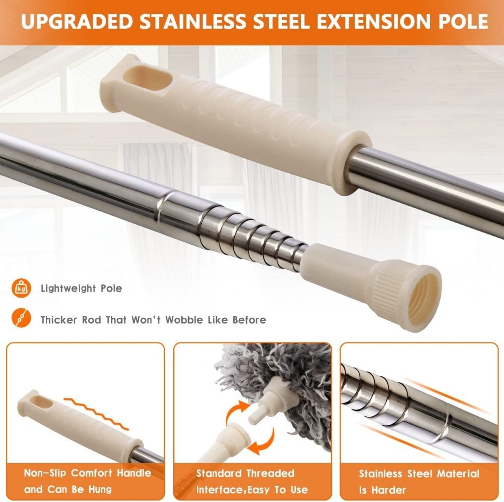 The stainless steel handle is retractable and can easily be extended to a maximum length of 100″. It can wipe small cracks that are difficult to reach and is easy to rotate and wipe clean. Great for cleaning the dust of high places.